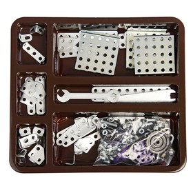 - 155 металлических деталей: В комплект входят пластины, уголки, оси и крепежные элементы. Набор позволяет создавать подвижные механизмы и укреплять навыки конструирования.