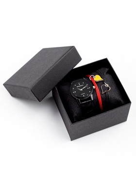 Набор мужских часов с массивным циферблатом в серебристой огранке дополнен браслетами черного и красного цвета, на каждом из которых расположены ключ и замок, как символ сокровенности и исключительности.